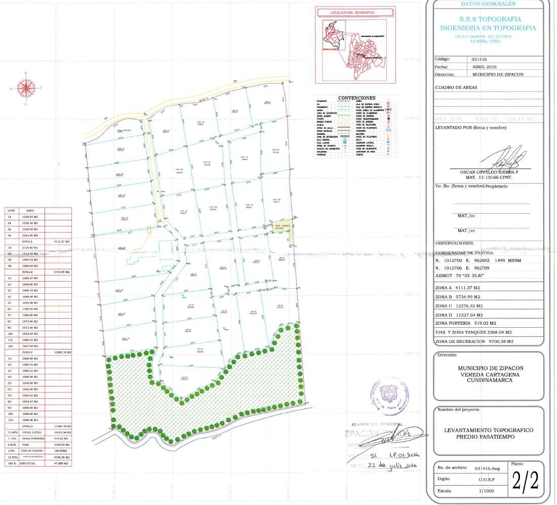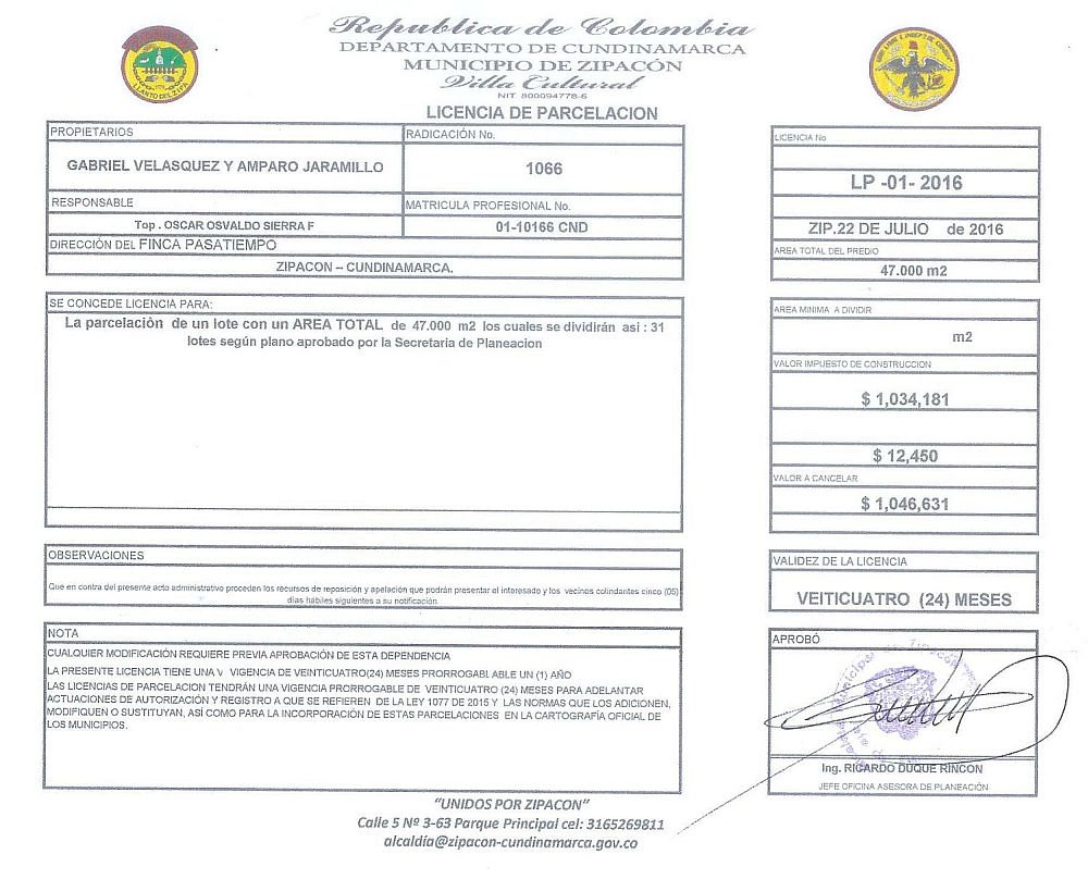 Condominio Campestre PASATIEMPO Vereda El Ocaso Municipio de Zipacon, Cundinamarca Lotes De 1.000Mts2 Con Vista a las montanas, clima delicioso 22 Grados a solo 1.5 Horas de Bogota Zona de porteria y Casa administrativa para brindar seguridad a todos sus propietarios, parqueadero para visitantes, Alumbrado publico, carreteras en recebo compactado, parque infantil, area de BBQ, Senderos propios para caminar a los pozos del Rio Apulo, amplias zonas verdes, bosques nativos, Cada propietario puede construir su casa dentro de las normas establecidas por el condominio, Cada lote se entrega con Punto de Agua y Punto de Energia, Tel: 321-291-1856 gabri324@gmail.com |